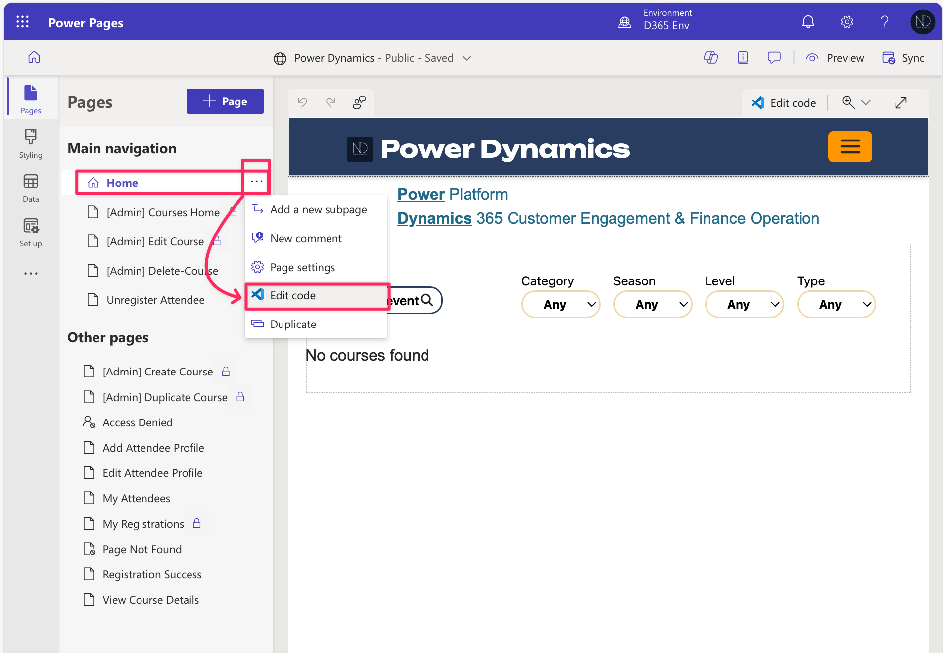 Now, in the Power Pages Studio, on your **Page** on which **you had configured the "Live Chat Widget"** >> click the **\<Edit code>.**  The Power Pages code will be loaded in the Visual Studio Code on the web in the new tab.