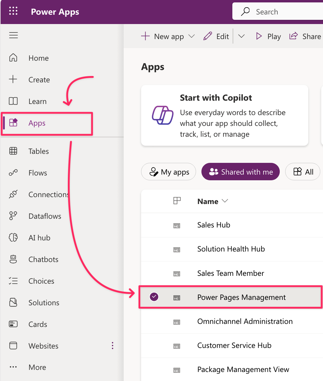 | <img src="https://4233060750-files.gitbook.io/~/files/v0/b/gitbook-x-prod.appspot.com/o/spaces%2FjhtQupP7ACZVtv3cCNCr%2Fuploads%2F6IoUzFcpX5VTmKXbZKsf%2FCleanShot%202024-04-12%20at%2010.05.24%402x.png?alt=media&#x26;token=aba10fed-2753-4e9f-aa07-19d493522e38" alt="" data-size="original"> | In Power Apps Studio > select Apps > then click open **Power Pages Management** application   |