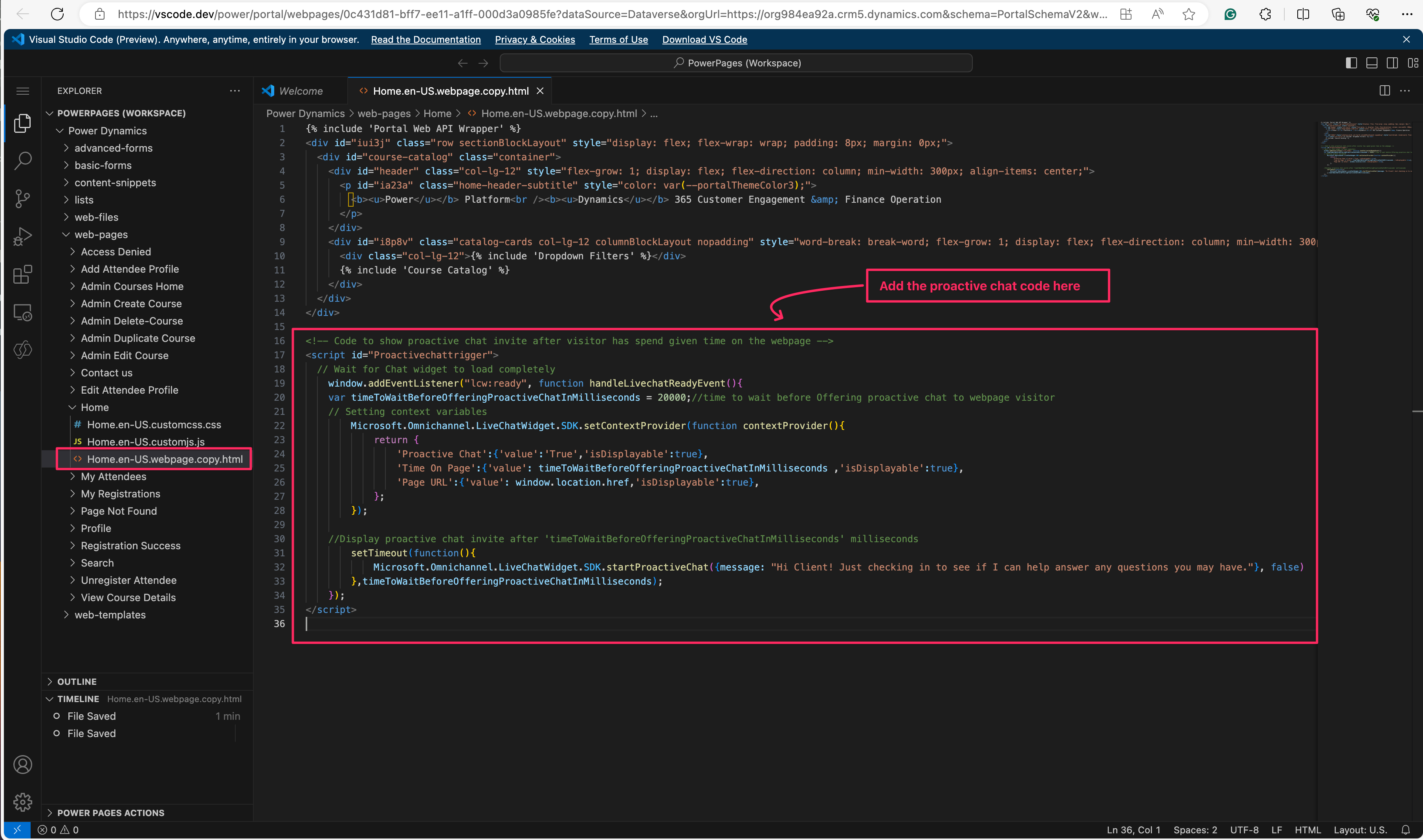 My sample: I configured the Live Chat Widget on the **Home page**. So, I will input the proactive chat code for this page.&#x20;