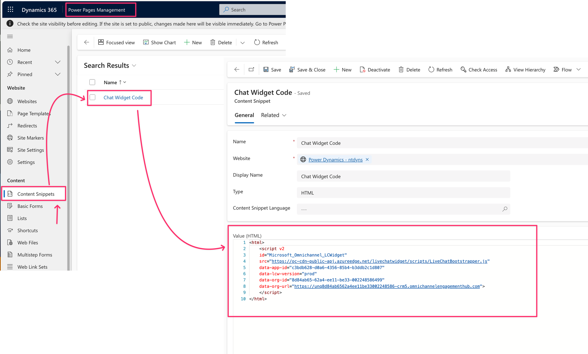 After that, you just copy the [Chat Widget's code snippet](https://dyns.ntd.asia/power-dynamics/d365-ce/customer-experience/omnichannel/internal-live-chat-in-mda#create-a-live-chat-channel) and then paste it to the **Value (HTML)** as below.