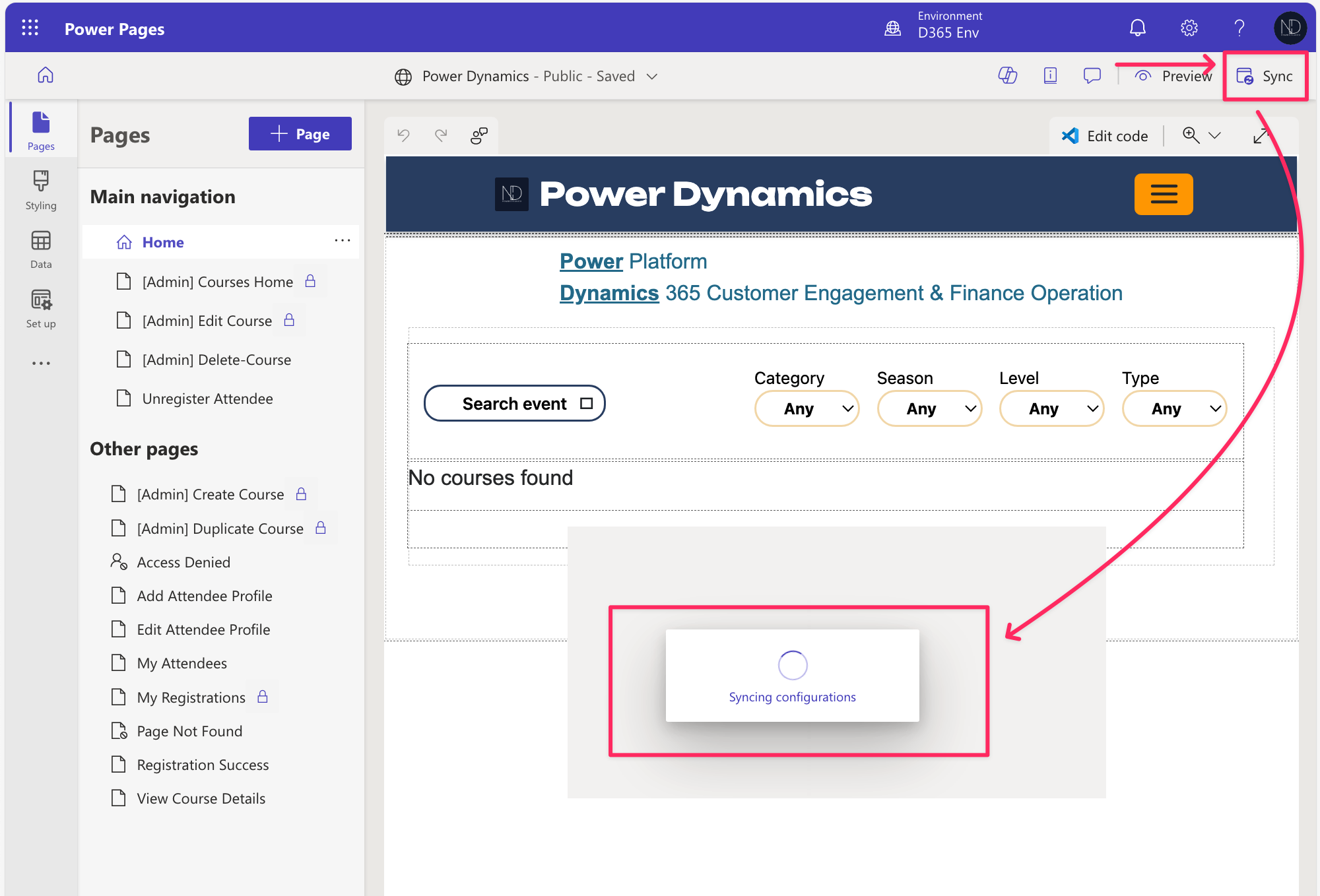 <figure><img src="https://4233060750-files.gitbook.io/~/files/v0/b/gitbook-x-prod.appspot.com/o/spaces%2FjhtQupP7ACZVtv3cCNCr%2Fuploads%2FlfK2kxf90Q7TeqdfgJ1U%2FCleanShot%202024-04-12%20at%2013.22.28%402x.png?alt=media&#x26;token=124d1c1f-29f4-4fd8-a4af-54c41885aba8" alt=""><figcaption><p>Sync latest code for Power Page</p></figcaption></figure>