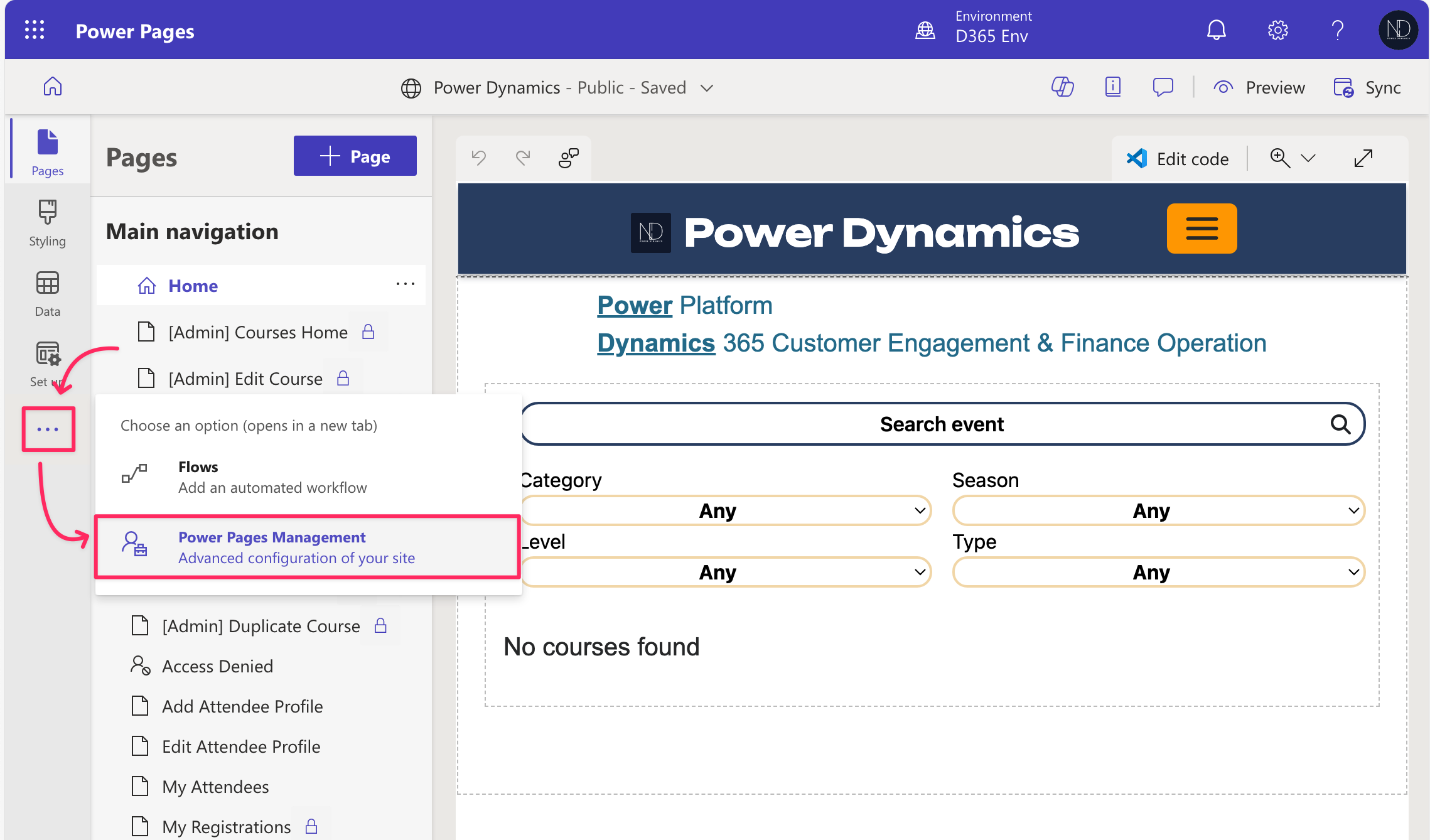 | <img src="https://4233060750-files.gitbook.io/~/files/v0/b/gitbook-x-prod.appspot.com/o/spaces%2FjhtQupP7ACZVtv3cCNCr%2Fuploads%2FxHwBHOEJiYWVMUa26ON9%2FCleanShot%202024-04-12%20at%2010.08.15%402x.png?alt=media&#x26;token=301e2847-98e6-454e-86ac-fecc286d5f8b" alt="" data-size="original"> | In the Power Pages site editor > select **<...>** icon then click **Power Pages Management.** |