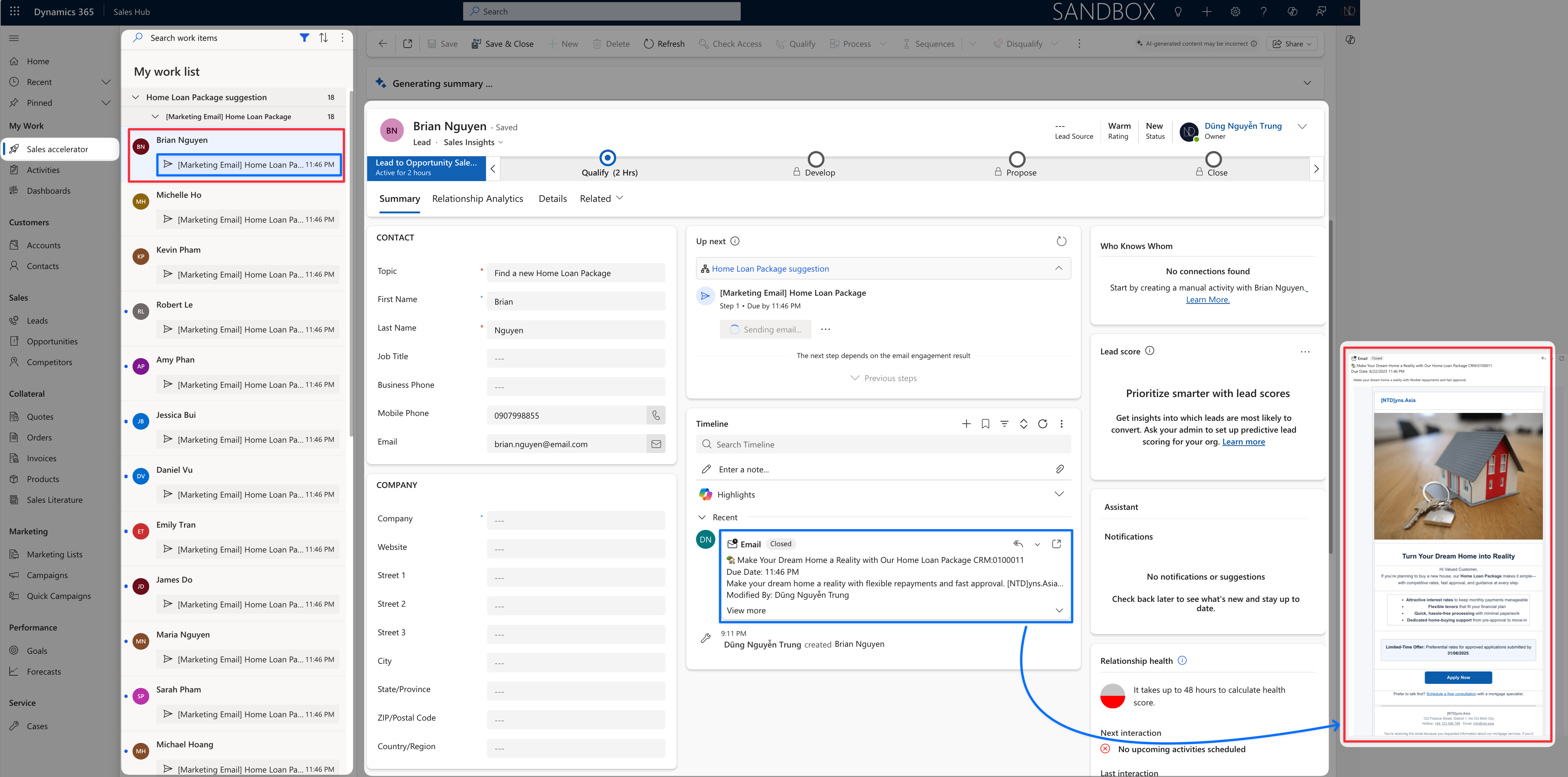 For the checking results, I will move on to the Sales Accelerator workspace. The list of Sequence's activities will be shown, and the first Marketing Email "Home Loan Package" will be sent to the client.