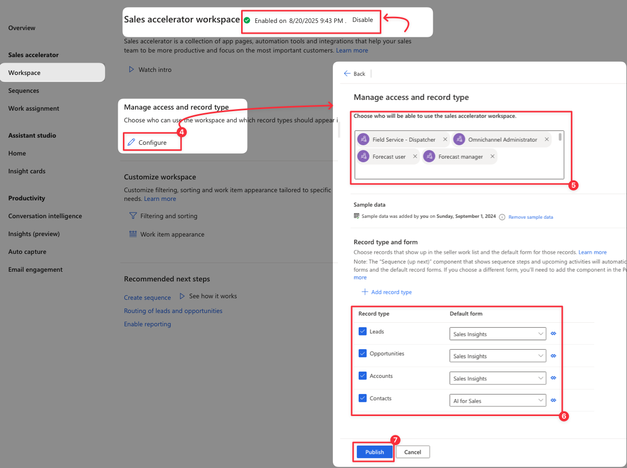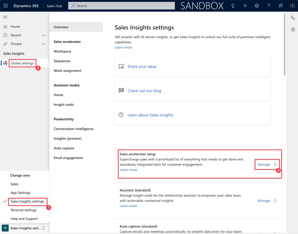 In the Sales Hub app, navigate to the Sales Insight setting option. In here, we can check that the sales accelerator was enabled and get started with Workspace configuration quickly.