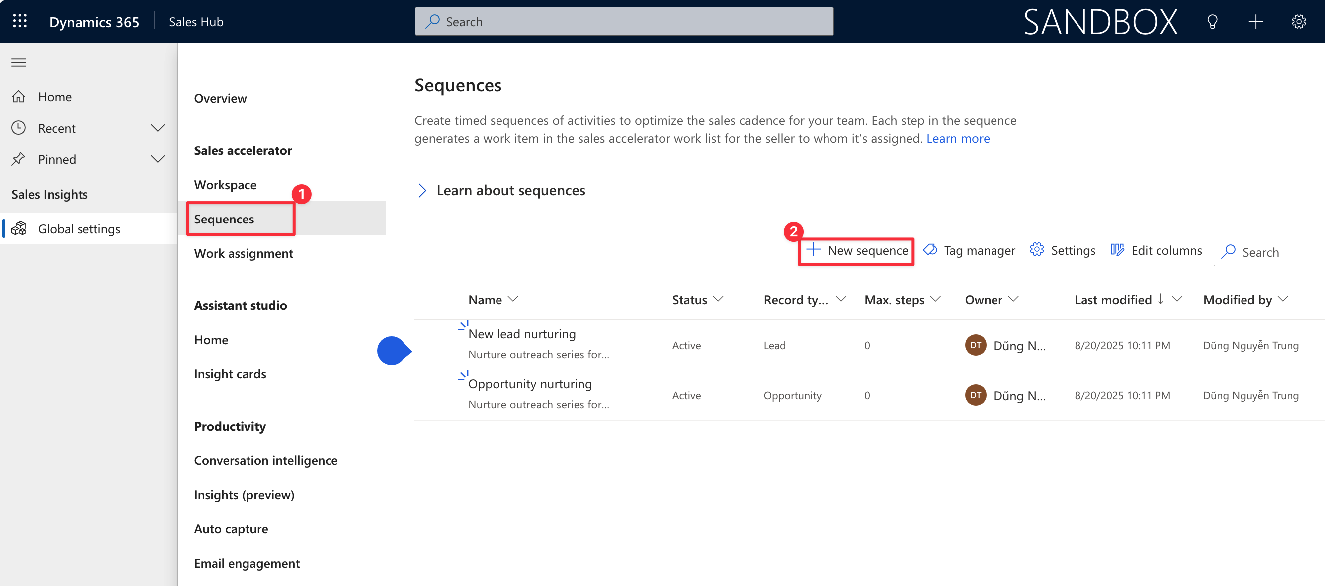 At the Sales Insight setting, under Sales accelerator, navigate to Sequences menu and click <+New Sequence> button to create.