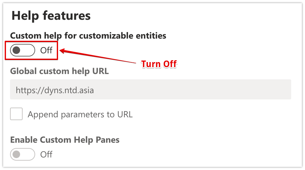 If the option is disabled, please make sure the option **Custom help for customizable entities** has been turned off. (*Path: Power Platform Admin Center > Feature > under Help features).*