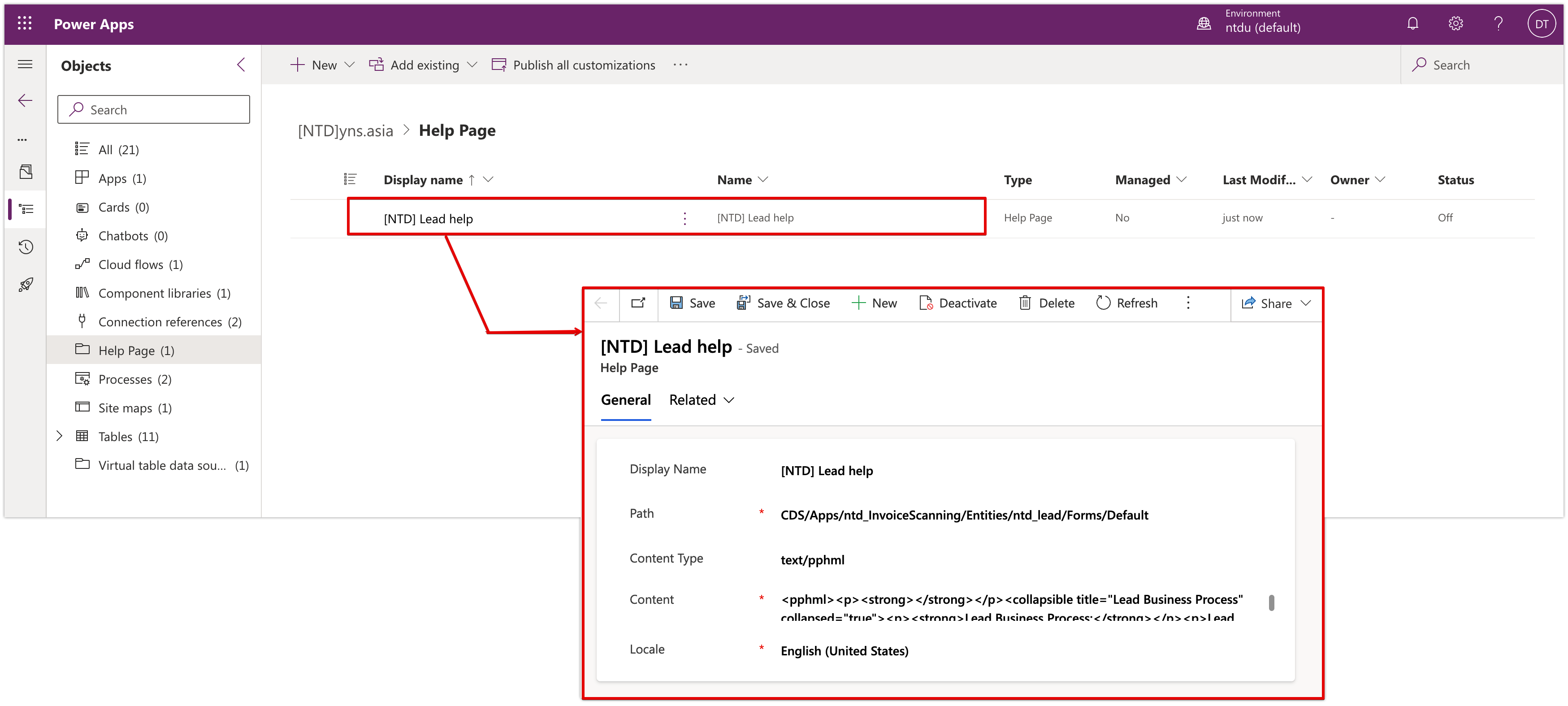 After adding to the solution, you can click open the Help page record and edit as below.