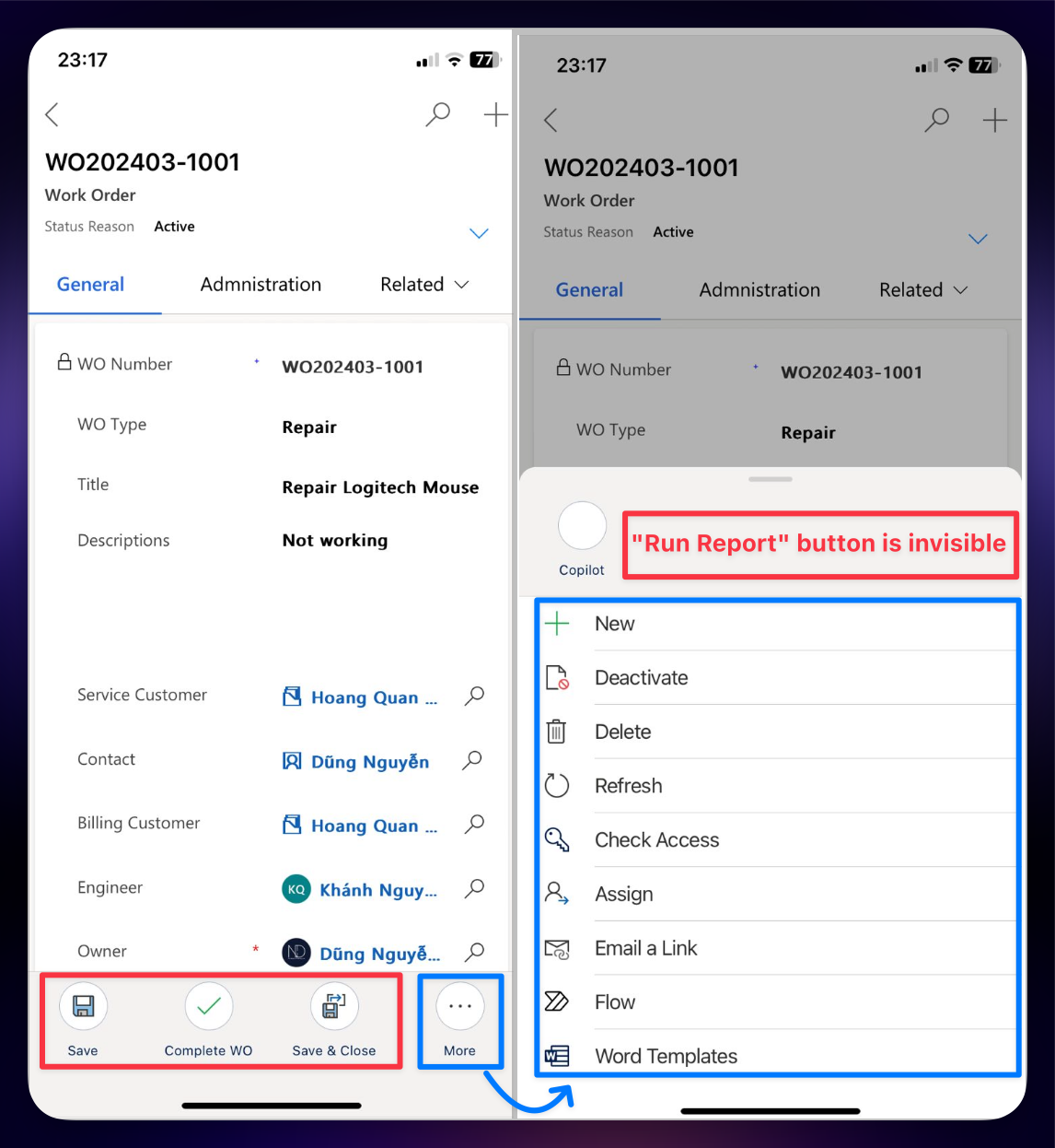 * **MDA on Power Apps Mobile:** Open the Work Order form, and the "Run Report" button is invisible.