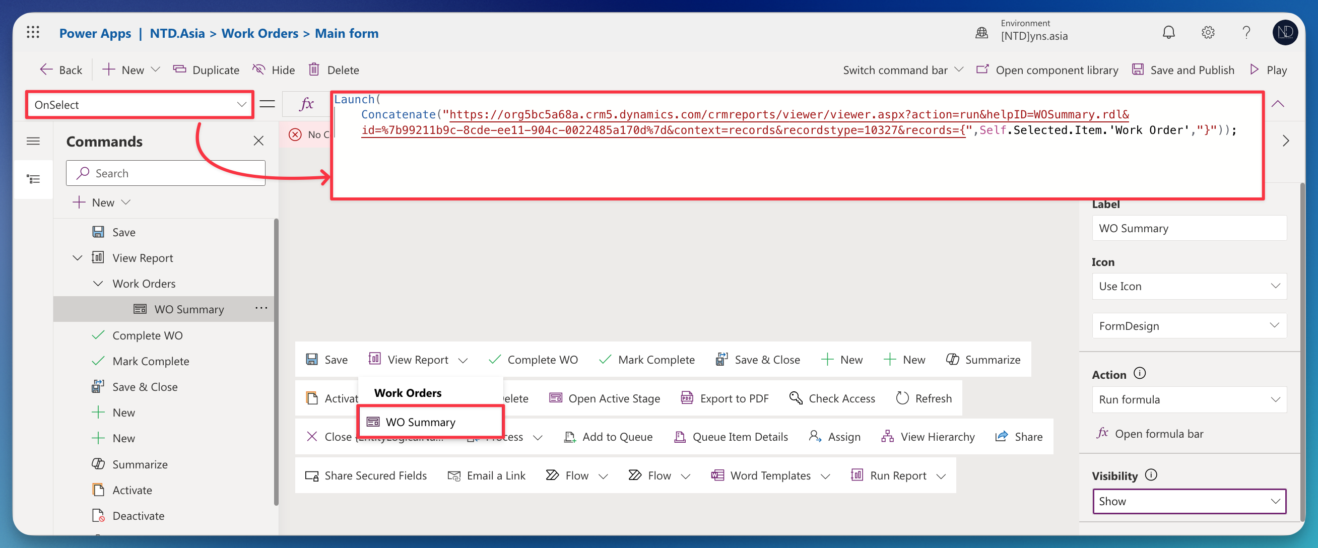 <figure><img src="https://4233060750-files.gitbook.io/~/files/v0/b/gitbook-x-prod.appspot.com/o/spaces%2FjhtQupP7ACZVtv3cCNCr%2Fuploads%2FvnVcsIiMM9Slv3wM0vPF%2FCleanShot%202024-07-07%20at%2009.57.19%402x.png?alt=media&#x26;token=0b97ba2f-695f-4b1e-9ed3-05e1a46529e7" alt=""><figcaption><p>Button with PowerFx fomular: Run report "WOSummary"</p></figcaption></figure>